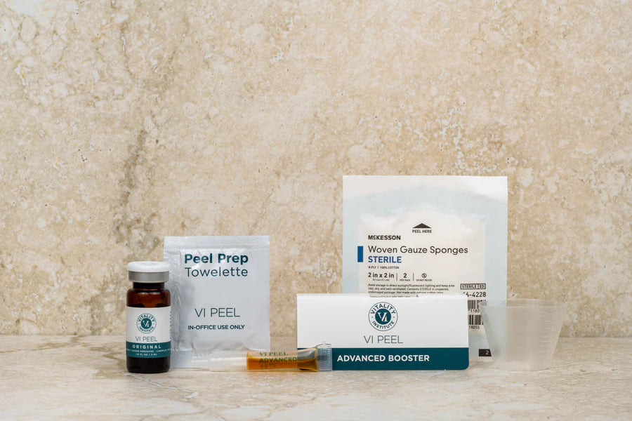 VI Peel Advanced is a strongest peel with a booster system formulated to combat the effects of aging. It is made with a powerful blend of ingredients to provide a deeper penetration to soften fine lines and wrinkles, enhance cellular turnover, and stimulate collagen production.